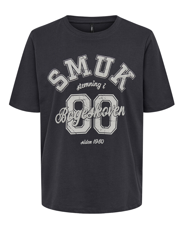 Mørk grå t-shirt med påtrykt "SMUK stemning i Bøgeskoven siden 1980"