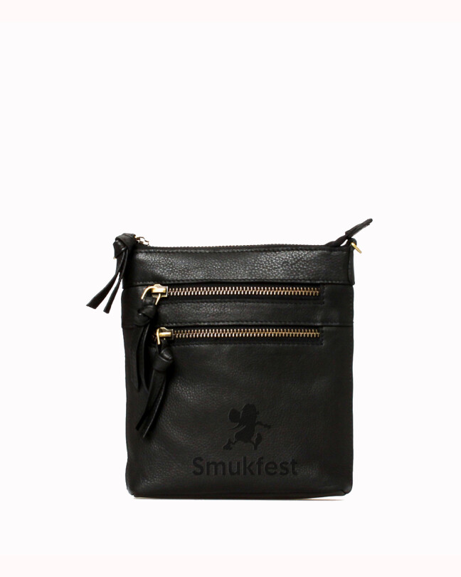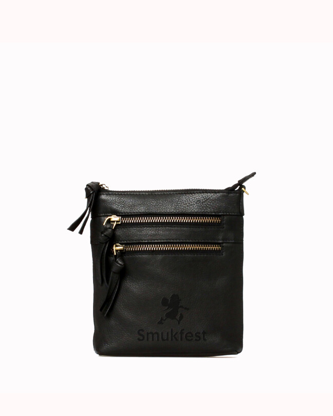 Lille crossbody taske i sort læder præget med Smukfest og Walther.